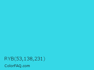 RYB 53,138,231 Color is a normal cyan color and the nearest color is Turquoise #40e0d0. Hex code #35d8e7 and RGB value is rgb(53,216,231). In RGB color space, this color is composed of 21% red, 85% green, 91% blue, In CMYK color space, this color is composed of 77% cyan, 6% magenta, 0% yellow , 9% black , In HSL color space, this color has a hue angle of 185° , 79% saturation and 56% lightness.