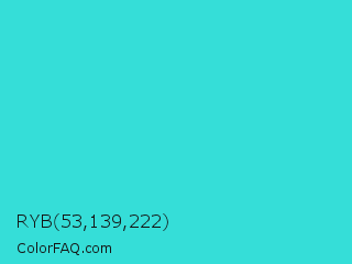 RYB 53,139,222 Color is a normal cyan color and the nearest color is Turquoise #40e0d0. Hex code #35ded8 and RGB value is rgb(53,222,216). In RGB color space, this color is composed of 21% red, 87% green, 85% blue, In CMYK color space, this color is composed of 76% cyan, 0% magenta, 3% yellow , 13% black , In HSL color space, this color has a hue angle of 178° , 72% saturation and 54% lightness.