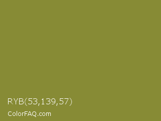 RYB 53,139,57 Color is a normal yellow color and the nearest color is Sycamore #908d39. Hex code #878b35 and RGB value is rgb(135,139,53). In RGB color space, this color is composed of 53% red, 55% green, 21% blue, In CMYK color space, this color is composed of 3% cyan, 0% magenta, 62% yellow , 45% black , In HSL color space, this color has a hue angle of 63° , 45% saturation and 38% lightness.