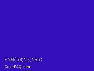 RYB 53,13,185 Color is a normal indigo color and the nearest color is Interdimensional Blue #360ccc. Hex code #350db9 and RGB value is rgb(53,13,185). In RGB color space, this color is composed of 21% red, 5% green, 73% blue, In CMYK color space, this color is composed of 71% cyan, 93% magenta, 0% yellow , 27% black , In HSL color space, this color has a hue angle of 254° , 87% saturation and 39% lightness.