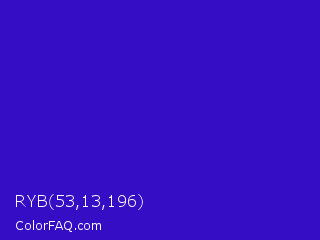 RYB 53,13,196 Color is a normal indigo color and the nearest color is Interdimensional Blue #360ccc. Hex code #350dc4 and RGB value is rgb(53,13,196). In RGB color space, this color is composed of 21% red, 5% green, 77% blue, In CMYK color space, this color is composed of 73% cyan, 93% magenta, 0% yellow , 23% black , In HSL color space, this color has a hue angle of 253° , 88% saturation and 41% lightness.