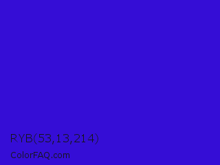 RYB 53,13,214 Color is a normal indigo color and the nearest color is Interdimensional Blue #360ccc. Hex code #350dd6 and RGB value is rgb(53,13,214). In RGB color space, this color is composed of 21% red, 5% green, 84% blue, In CMYK color space, this color is composed of 75% cyan, 94% magenta, 0% yellow , 16% black , In HSL color space, this color has a hue angle of 252° , 89% saturation and 45% lightness.