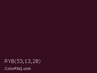 RYB 53,13,28 Color is a very dark rose color and the nearest color is Tamarind #341515. Hex code #350d1c and RGB value is rgb(53,13,28). In RGB color space, this color is composed of 21% red, 5% green, 11% blue, In CMYK color space, this color is composed of 0% cyan, 75% magenta, 47% yellow , 79% black , In HSL color space, this color has a hue angle of 338° , 61% saturation and 13% lightness.