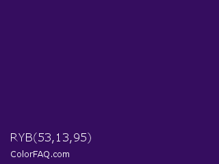 RYB 53,13,95 Color is a very dark violet color and the nearest color is Jagger #350e57. Hex code #350d5f and RGB value is rgb(53,13,95). In RGB color space, this color is composed of 21% red, 5% green, 37% blue, In CMYK color space, this color is composed of 44% cyan, 86% magenta, 0% yellow , 63% black , In HSL color space, this color has a hue angle of 269° , 76% saturation and 21% lightness.