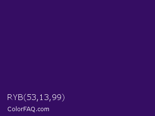 RYB 53,13,99 Color is a very dark violet color and the nearest color is Jagger #350e57. Hex code #350d63 and RGB value is rgb(53,13,99). In RGB color space, this color is composed of 21% red, 5% green, 39% blue, In CMYK color space, this color is composed of 46% cyan, 87% magenta, 0% yellow , 61% black , In HSL color space, this color has a hue angle of 268° , 77% saturation and 22% lightness.