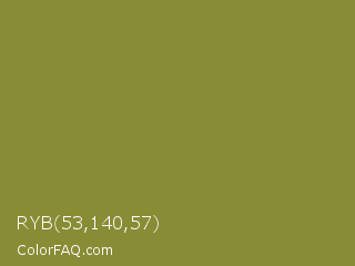 RYB 53,140,57 Color is a normal yellow color and the nearest color is Sycamore #908d39. Hex code #888c35 and RGB value is rgb(136,140,53). In RGB color space, this color is composed of 53% red, 55% green, 21% blue, In CMYK color space, this color is composed of 3% cyan, 0% magenta, 62% yellow , 45% black , In HSL color space, this color has a hue angle of 63° , 45% saturation and 38% lightness.