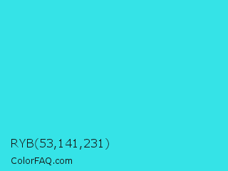 RYB 53,141,231 Color is a normal cyan color and the nearest color is Turquoise #40e0d0. Hex code #35e3e7 and RGB value is rgb(53,227,231). In RGB color space, this color is composed of 21% red, 89% green, 91% blue, In CMYK color space, this color is composed of 77% cyan, 2% magenta, 0% yellow , 9% black , In HSL color space, this color has a hue angle of 181° , 79% saturation and 56% lightness.