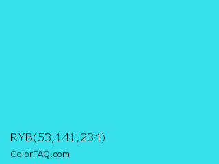 RYB 53,141,234 Color is a normal cyan color and the nearest color is Turquoise #40e0d0. Hex code #35e0ea and RGB value is rgb(53,224,234). In RGB color space, this color is composed of 21% red, 88% green, 92% blue, In CMYK color space, this color is composed of 77% cyan, 4% magenta, 0% yellow , 8% black , In HSL color space, this color has a hue angle of 183° , 81% saturation and 56% lightness.