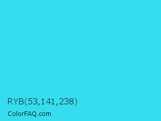 RYB 53,141,238 Color is a normal cyan color and the nearest color is Turquoise #40e0d0. Hex code #35ddee and RGB value is rgb(53,221,238). In RGB color space, this color is composed of 21% red, 87% green, 93% blue, In CMYK color space, this color is composed of 78% cyan, 7% magenta, 0% yellow , 7% black , In HSL color space, this color has a hue angle of 186° , 84% saturation and 57% lightness.