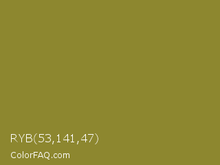 RYB 53,141,47 Color is a normal yellow color and the nearest color is Sycamore #908d39. Hex code #8d872f and RGB value is rgb(141,135,47). In RGB color space, this color is composed of 55% red, 53% green, 18% blue, In CMYK color space, this color is composed of 0% cyan, 4% magenta, 67% yellow , 45% black , In HSL color space, this color has a hue angle of 56° , 50% saturation and 37% lightness.