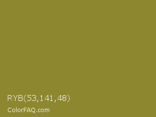 RYB 53,141,48 Color is a normal yellow color and the nearest color is Sycamore #908d39. Hex code #8d8830 and RGB value is rgb(141,136,48). In RGB color space, this color is composed of 55% red, 53% green, 19% blue, In CMYK color space, this color is composed of 0% cyan, 4% magenta, 66% yellow , 45% black , In HSL color space, this color has a hue angle of 57° , 49% saturation and 37% lightness.
