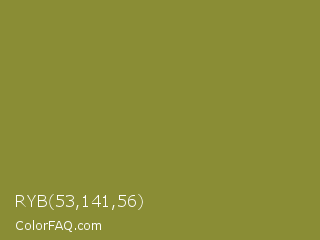 RYB 53,141,56 Color is a normal yellow color and the nearest color is Sycamore #908d39. Hex code #8a8d35 and RGB value is rgb(138,141,53). In RGB color space, this color is composed of 54% red, 55% green, 21% blue, In CMYK color space, this color is composed of 2% cyan, 0% magenta, 62% yellow , 45% black , In HSL color space, this color has a hue angle of 62° , 45% saturation and 38% lightness.