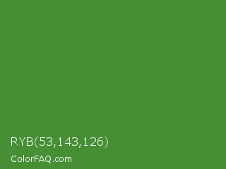 RYB 53,143,126 Color is a normal green color and the nearest color is May Green #4c9141. Hex code #468f35 and RGB value is rgb(70,143,53). In RGB color space, this color is composed of 27% red, 56% green, 21% blue, In CMYK color space, this color is composed of 51% cyan, 0% magenta, 63% yellow , 44% black , In HSL color space, this color has a hue angle of 109° , 46% saturation and 38% lightness.