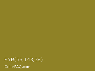 RYB 53,143,38 Color is a normal yellow color and the nearest color is Hacienda #98811b. Hex code #8f8226 and RGB value is rgb(143,130,38). In RGB color space, this color is composed of 56% red, 51% green, 15% blue, In CMYK color space, this color is composed of 0% cyan, 9% magenta, 73% yellow , 44% black , In HSL color space, this color has a hue angle of 53° , 58% saturation and 35% lightness.