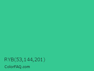 RYB 53,144,201 Color is a normal green color and the nearest color is Shamrock #33cc99. Hex code #35c992 and RGB value is rgb(53,201,146). In RGB color space, this color is composed of 21% red, 79% green, 57% blue, In CMYK color space, this color is composed of 74% cyan, 0% magenta, 27% yellow , 21% black , In HSL color space, this color has a hue angle of 158° , 58% saturation and 50% lightness.