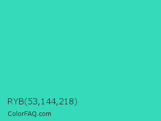RYB 53,144,218 Color is a normal cyan color and the nearest color is Turquoise PWG #30d5c8. Hex code #35dabb and RGB value is rgb(53,218,187). In RGB color space, this color is composed of 21% red, 85% green, 73% blue, In CMYK color space, this color is composed of 76% cyan, 0% magenta, 14% yellow , 15% black , In HSL color space, this color has a hue angle of 169° , 69% saturation and 53% lightness.