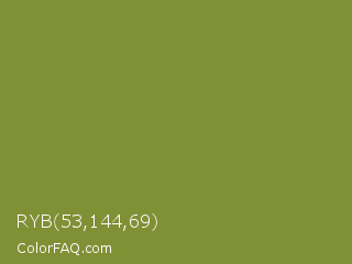 RYB 53,144,69 Color is a normal lime color and the nearest color is Sycamore #908d39. Hex code #809035 and RGB value is rgb(128,144,53). In RGB color space, this color is composed of 50% red, 56% green, 21% blue, In CMYK color space, this color is composed of 11% cyan, 0% magenta, 63% yellow , 44% black , In HSL color space, this color has a hue angle of 71° , 46% saturation and 39% lightness.