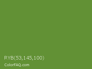 RYB 53,145,100 Color is a normal green color and the nearest color is Maximum Green #5e8c31. Hex code #629135 and RGB value is rgb(98,145,53). In RGB color space, this color is composed of 38% red, 57% green, 21% blue, In CMYK color space, this color is composed of 32% cyan, 0% magenta, 63% yellow , 43% black , In HSL color space, this color has a hue angle of 91° , 46% saturation and 39% lightness.