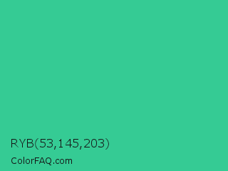 RYB 53,145,203 Color is a normal green color and the nearest color is Shamrock #33cc99. Hex code #35cb94 and RGB value is rgb(53,203,148). In RGB color space, this color is composed of 21% red, 80% green, 58% blue, In CMYK color space, this color is composed of 74% cyan, 0% magenta, 27% yellow , 20% black , In HSL color space, this color has a hue angle of 158° , 59% saturation and 50% lightness.