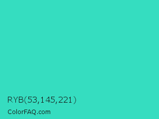 RYB 53,145,221 Color is a normal cyan color and the nearest color is Turquoise PWG #30d5c8. Hex code #35ddc0 and RGB value is rgb(53,221,192). In RGB color space, this color is composed of 21% red, 87% green, 75% blue, In CMYK color space, this color is composed of 76% cyan, 0% magenta, 13% yellow , 13% black , In HSL color space, this color has a hue angle of 170° , 71% saturation and 54% lightness.