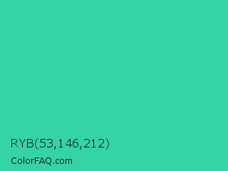 RYB 53,146,212 Color is a normal green color and the nearest color is Shamrock #33cc99. Hex code #35d4a6 and RGB value is rgb(53,212,166). In RGB color space, this color is composed of 21% red, 83% green, 65% blue, In CMYK color space, this color is composed of 75% cyan, 0% magenta, 22% yellow , 17% black , In HSL color space, this color has a hue angle of 163° , 65% saturation and 52% lightness.