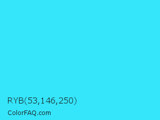 RYB 53,146,250 Color is a normal cyan color and the nearest color is Loeen #15f2fd. Hex code #35e5fa and RGB value is rgb(53,229,250). In RGB color space, this color is composed of 21% red, 90% green, 98% blue, In CMYK color space, this color is composed of 79% cyan, 8% magenta, 0% yellow , 2% black , In HSL color space, this color has a hue angle of 186° , 95% saturation and 59% lightness.