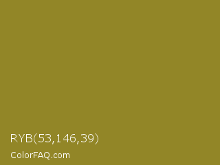 RYB 53,146,39 Color is a normal yellow color and the nearest color is Hacienda #98811b. Hex code #928627 and RGB value is rgb(146,134,39). In RGB color space, this color is composed of 57% red, 53% green, 15% blue, In CMYK color space, this color is composed of 0% cyan, 8% magenta, 73% yellow , 43% black , In HSL color space, this color has a hue angle of 53° , 58% saturation and 36% lightness.