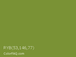 RYB 53,146,77 Color is a normal lime color and the nearest color is Palm Leaf #6f9940. Hex code #7a9235 and RGB value is rgb(122,146,53). In RGB color space, this color is composed of 48% red, 57% green, 21% blue, In CMYK color space, this color is composed of 16% cyan, 0% magenta, 64% yellow , 43% black , In HSL color space, this color has a hue angle of 75° , 47% saturation and 39% lightness.