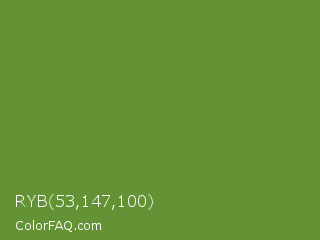 RYB 53,147,100 Color is a normal green color and the nearest color is Maximum Green #5e8c31. Hex code #649335 and RGB value is rgb(100,147,53). In RGB color space, this color is composed of 39% red, 58% green, 21% blue, In CMYK color space, this color is composed of 32% cyan, 0% magenta, 64% yellow , 42% black , In HSL color space, this color has a hue angle of 90° , 47% saturation and 39% lightness.