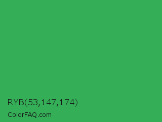 RYB 53,147,174 Color is a normal green color and the nearest color is Chateau Green #40a860. Hex code #35ae58 and RGB value is rgb(53,174,88). In RGB color space, this color is composed of 21% red, 68% green, 35% blue, In CMYK color space, this color is composed of 70% cyan, 0% magenta, 49% yellow , 32% black , In HSL color space, this color has a hue angle of 137° , 53% saturation and 45% lightness.