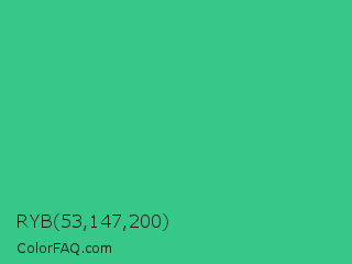 RYB 53,147,200 Color is a normal green color and the nearest color is Mountain Meadow #30ba8f. Hex code #35c888 and RGB value is rgb(53,200,136). In RGB color space, this color is composed of 21% red, 78% green, 53% blue, In CMYK color space, this color is composed of 74% cyan, 0% magenta, 32% yellow , 22% black , In HSL color space, this color has a hue angle of 154° , 58% saturation and 50% lightness.