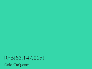 RYB 53,147,215 Color is a normal green color and the nearest color is Eucalyptus #44d7a8. Hex code #35d7aa and RGB value is rgb(53,215,170). In RGB color space, this color is composed of 21% red, 84% green, 67% blue, In CMYK color space, this color is composed of 75% cyan, 0% magenta, 21% yellow , 16% black , In HSL color space, this color has a hue angle of 163° , 67% saturation and 53% lightness.