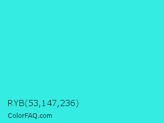 RYB 53,147,236 Color is a normal cyan color and the nearest color is Turquoise #40e0d0. Hex code #35ece2 and RGB value is rgb(53,236,226). In RGB color space, this color is composed of 21% red, 93% green, 89% blue, In CMYK color space, this color is composed of 78% cyan, 0% magenta, 4% yellow , 7% black , In HSL color space, this color has a hue angle of 177° , 83% saturation and 57% lightness.