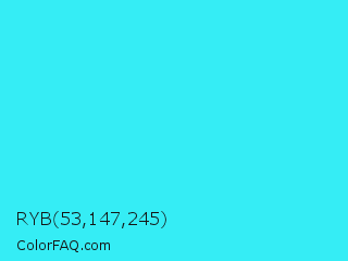 RYB 53,147,245 Color is a normal cyan color and the nearest color is Loeen #15f2fd. Hex code #35edf5 and RGB value is rgb(53,237,245). In RGB color space, this color is composed of 21% red, 93% green, 96% blue, In CMYK color space, this color is composed of 78% cyan, 3% magenta, 0% yellow , 4% black , In HSL color space, this color has a hue angle of 183° , 91% saturation and 58% lightness.