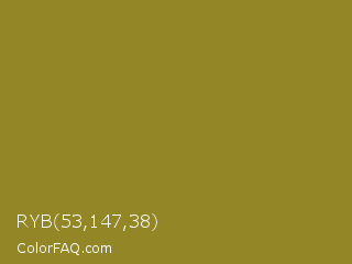 RYB 53,147,38 Color is a normal yellow color and the nearest color is Hacienda #98811b. Hex code #938626 and RGB value is rgb(147,134,38). In RGB color space, this color is composed of 58% red, 53% green, 15% blue, In CMYK color space, this color is composed of 0% cyan, 9% magenta, 74% yellow , 42% black , In HSL color space, this color has a hue angle of 53° , 59% saturation and 36% lightness.