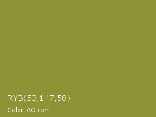 RYB 53,147,58 Color is a normal yellow color and the nearest color is Sycamore #908d39. Hex code #8e9335 and RGB value is rgb(142,147,53). In RGB color space, this color is composed of 56% red, 58% green, 21% blue, In CMYK color space, this color is composed of 3% cyan, 0% magenta, 64% yellow , 42% black , In HSL color space, this color has a hue angle of 63° , 47% saturation and 39% lightness.