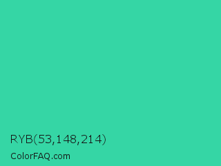 RYB 53,148,214 Color is a normal green color and the nearest color is Eucalyptus #44d7a8. Hex code #35d6a5 and RGB value is rgb(53,214,165). In RGB color space, this color is composed of 21% red, 84% green, 65% blue, In CMYK color space, this color is composed of 75% cyan, 0% magenta, 23% yellow , 16% black , In HSL color space, this color has a hue angle of 162° , 66% saturation and 52% lightness.