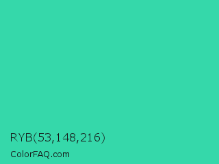 RYB 53,148,216 Color is a normal green color and the nearest color is Eucalyptus #44d7a8. Hex code #35d8aa and RGB value is rgb(53,216,170). In RGB color space, this color is composed of 21% red, 85% green, 67% blue, In CMYK color space, this color is composed of 75% cyan, 0% magenta, 21% yellow , 15% black , In HSL color space, this color has a hue angle of 163° , 68% saturation and 53% lightness.