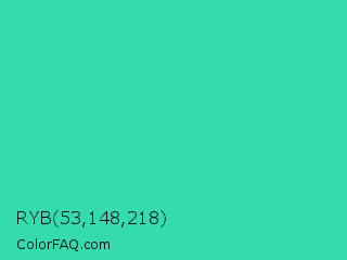 RYB 53,148,218 Color is a normal cyan color and the nearest color is Eucalyptus #44d7a8. Hex code #35daaf and RGB value is rgb(53,218,175). In RGB color space, this color is composed of 21% red, 85% green, 69% blue, In CMYK color space, this color is composed of 76% cyan, 0% magenta, 20% yellow , 15% black , In HSL color space, this color has a hue angle of 164° , 69% saturation and 53% lightness.
