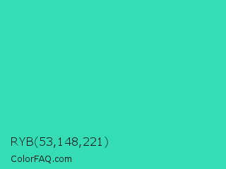 RYB 53,148,221 Color is a normal cyan color and the nearest color is Turquoise PWG #30d5c8. Hex code #35ddb6 and RGB value is rgb(53,221,182). In RGB color space, this color is composed of 21% red, 87% green, 71% blue, In CMYK color space, this color is composed of 76% cyan, 0% magenta, 18% yellow , 13% black , In HSL color space, this color has a hue angle of 166° , 71% saturation and 54% lightness.