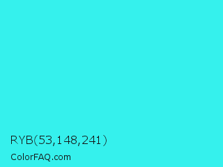 RYB 53,148,241 Color is a normal cyan color and the nearest color is Turquoise #40e0d0. Hex code #35f1ed and RGB value is rgb(53,241,237). In RGB color space, this color is composed of 21% red, 95% green, 93% blue, In CMYK color space, this color is composed of 78% cyan, 0% magenta, 2% yellow , 5% black , In HSL color space, this color has a hue angle of 179° , 87% saturation and 58% lightness.