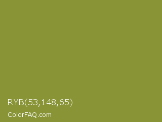 RYB 53,148,65 Color is a normal yellow color and the nearest color is Sycamore #908d39. Hex code #889435 and RGB value is rgb(136,148,53). In RGB color space, this color is composed of 53% red, 58% green, 21% blue, In CMYK color space, this color is composed of 8% cyan, 0% magenta, 64% yellow , 42% black , In HSL color space, this color has a hue angle of 68° , 47% saturation and 39% lightness.