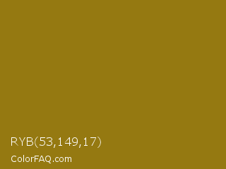 RYB 53,149,17 Color is a normal yellow color and the nearest color is Sand Dune #967117. Hex code #957911 and RGB value is rgb(149,121,17). In RGB color space, this color is composed of 58% red, 47% green, 7% blue, In CMYK color space, this color is composed of 0% cyan, 19% magenta, 89% yellow , 42% black , In HSL color space, this color has a hue angle of 47° , 80% saturation and 33% lightness.