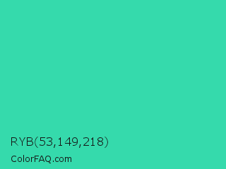 RYB 53,149,218 Color is a normal green color and the nearest color is Eucalyptus #44d7a8. Hex code #35daac and RGB value is rgb(53,218,172). In RGB color space, this color is composed of 21% red, 85% green, 67% blue, In CMYK color space, this color is composed of 76% cyan, 0% magenta, 21% yellow , 15% black , In HSL color space, this color has a hue angle of 163° , 69% saturation and 53% lightness.
