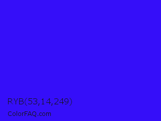 RYB 53,14,249 Color is a normal indigo color and the nearest color is Electric Ultramarine #3f00ff. Hex code #350ef9 and RGB value is rgb(53,14,249). In RGB color space, this color is composed of 21% red, 5% green, 98% blue, In CMYK color space, this color is composed of 79% cyan, 94% magenta, 0% yellow , 2% black , In HSL color space, this color has a hue angle of 250° , 95% saturation and 52% lightness.