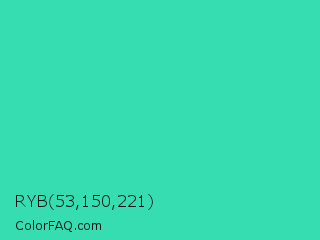 RYB 53,150,221 Color is a normal cyan color and the nearest color is Eucalyptus #44d7a8. Hex code #35ddb0 and RGB value is rgb(53,221,176). In RGB color space, this color is composed of 21% red, 87% green, 69% blue, In CMYK color space, this color is composed of 76% cyan, 0% magenta, 20% yellow , 13% black , In HSL color space, this color has a hue angle of 164° , 71% saturation and 54% lightness.