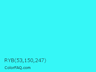 RYB 53,150,247 Color is a normal cyan color and the nearest color is Loeen #15f2fd. Hex code #35f7f7 and RGB value is rgb(53,247,247). In RGB color space, this color is composed of 21% red, 97% green, 97% blue, In CMYK color space, this color is composed of 79% cyan, 0% magenta, 0% yellow , 3% black , In HSL color space, this color has a hue angle of 180° , 92% saturation and 59% lightness.