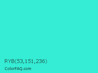 RYB 53,151,236 Color is a normal cyan color and the nearest color is Turquoise #40e0d0. Hex code #35ecd4 and RGB value is rgb(53,236,212). In RGB color space, this color is composed of 21% red, 93% green, 83% blue, In CMYK color space, this color is composed of 78% cyan, 0% magenta, 10% yellow , 7% black , In HSL color space, this color has a hue angle of 172° , 83% saturation and 57% lightness.