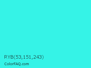 RYB 53,151,243 Color is a normal cyan color and the nearest color is Turquoise #40e0d0. Hex code #35f3e7 and RGB value is rgb(53,243,231). In RGB color space, this color is composed of 21% red, 95% green, 91% blue, In CMYK color space, this color is composed of 78% cyan, 0% magenta, 5% yellow , 5% black , In HSL color space, this color has a hue angle of 176° , 89% saturation and 58% lightness.