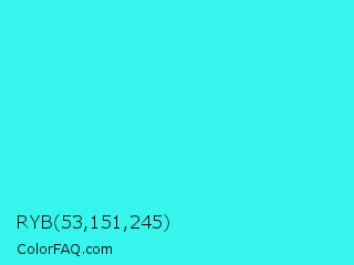 RYB 53,151,245 Color is a normal cyan color and the nearest color is Loeen #15f2fd. Hex code #35f5ed and RGB value is rgb(53,245,237). In RGB color space, this color is composed of 21% red, 96% green, 93% blue, In CMYK color space, this color is composed of 78% cyan, 0% magenta, 3% yellow , 4% black , In HSL color space, this color has a hue angle of 178° , 91% saturation and 58% lightness.